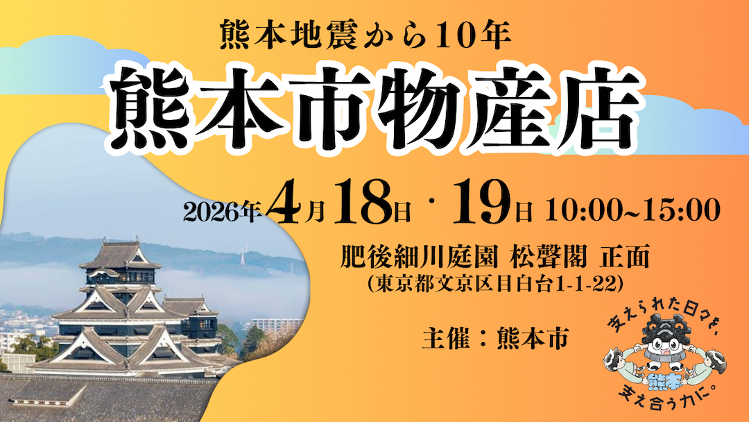熊本市は2026年4月18日(土)・19日(日)の2日間、東京都文京区にある肥後細川庭園にて、「-熊本地震から10年- 熊本市物産店」を開催します。
