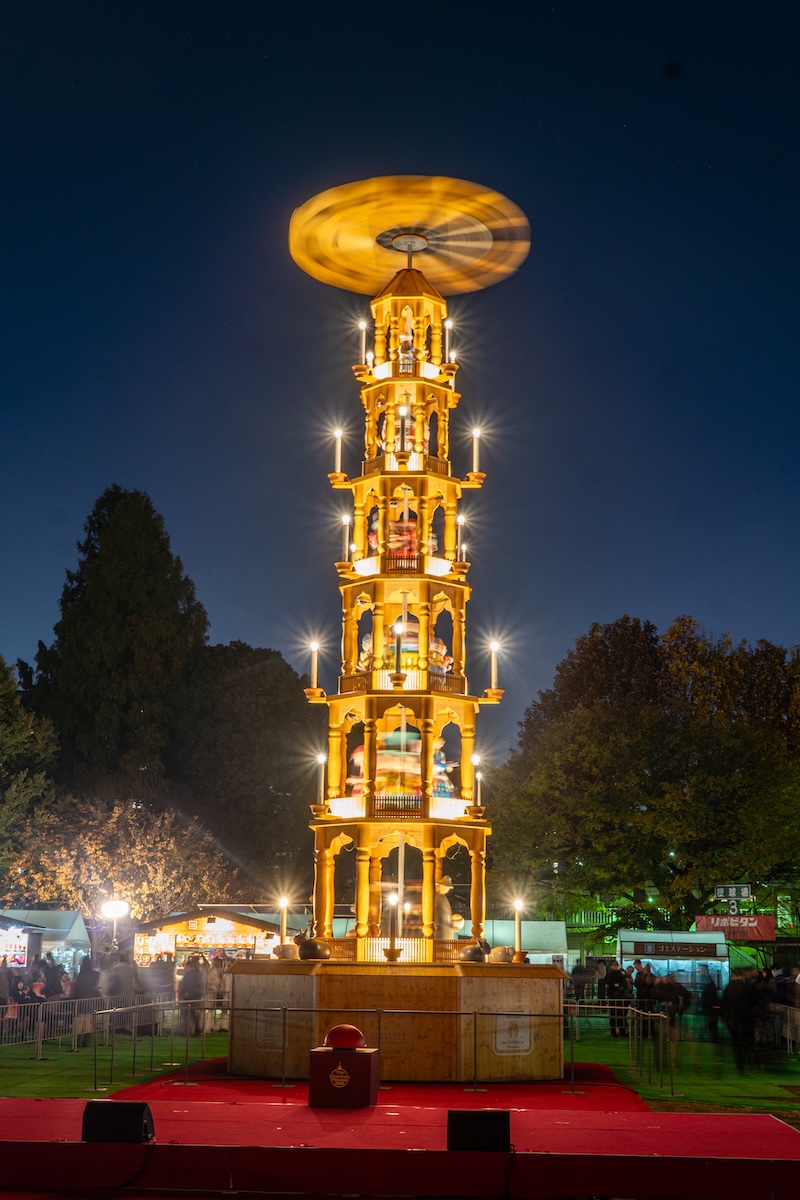 クリスマスマーケットは各地で開催されていますが、「東京クリスマスマーケット」の一番の特徴は、中央にそびえ立つ高さ14mの「クリスマスピラミッド」ですね。これもドレスデンの伝統的なものを模しています。このほか、本場では「ヒュッテ」と呼ばれる木製の小屋でフードや雑貨を販売を行うなど、木の温かみを感じられる会場作りにこだわっています。