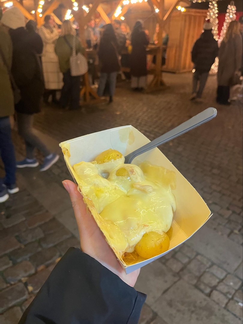 ソーセージやシチュー、焼き菓子、ラクレットチーズなど、寒い夜に思わず立ち止まってしまう香りが広場いっぱいに広がり、思わずお腹が鳴ってしまいます。