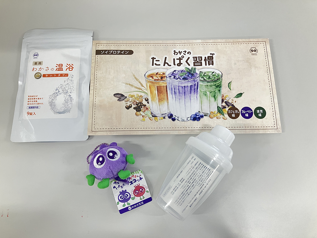 わかさ生活様からは、ツアーの取り組みにご共感いただき、ツアー参加者の皆様に対して、旅の疲れを癒してくれる、入浴剤「わかさの温浴」やソイプロテイン「わかさのたんぱく習慣」、ブルブルくんなどをご提供いただき、参加者から大好評でした。