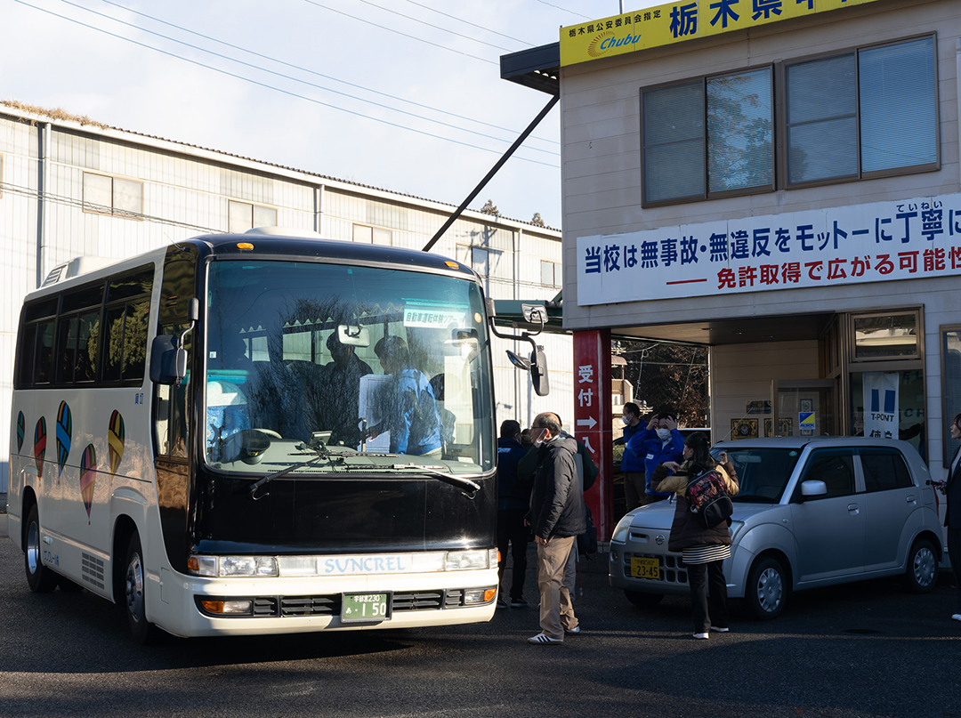 紅葉が終盤を迎え、朝に霜柱が立ち始めた12月の栃木県宇都宮市西部。一台の貸切バスが、栃木県中部自動車学校に到着しました。