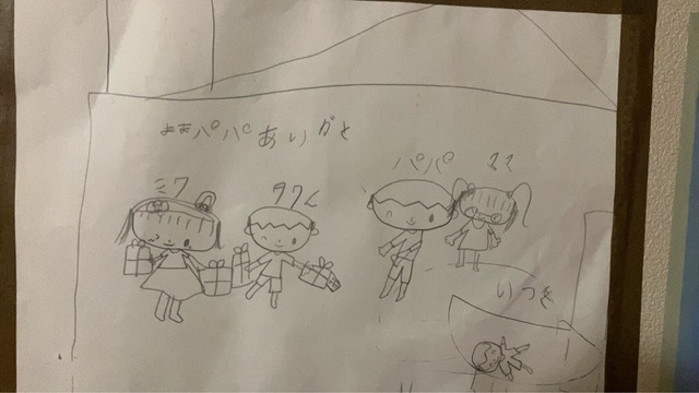 例えば、お父さんの絵を描くときは、お母さんに“お父さんが好きなもの”を聞いて、それをこっそり絵に入れていました。