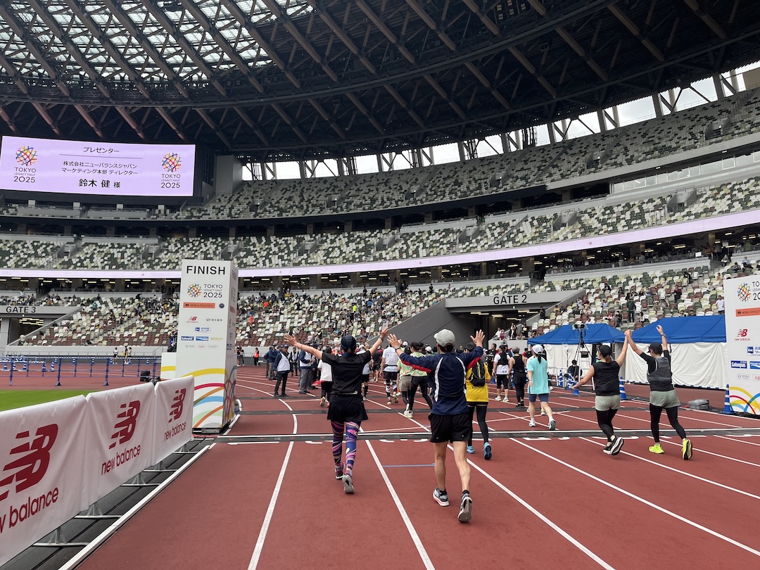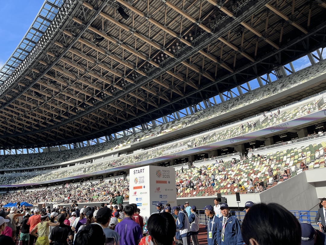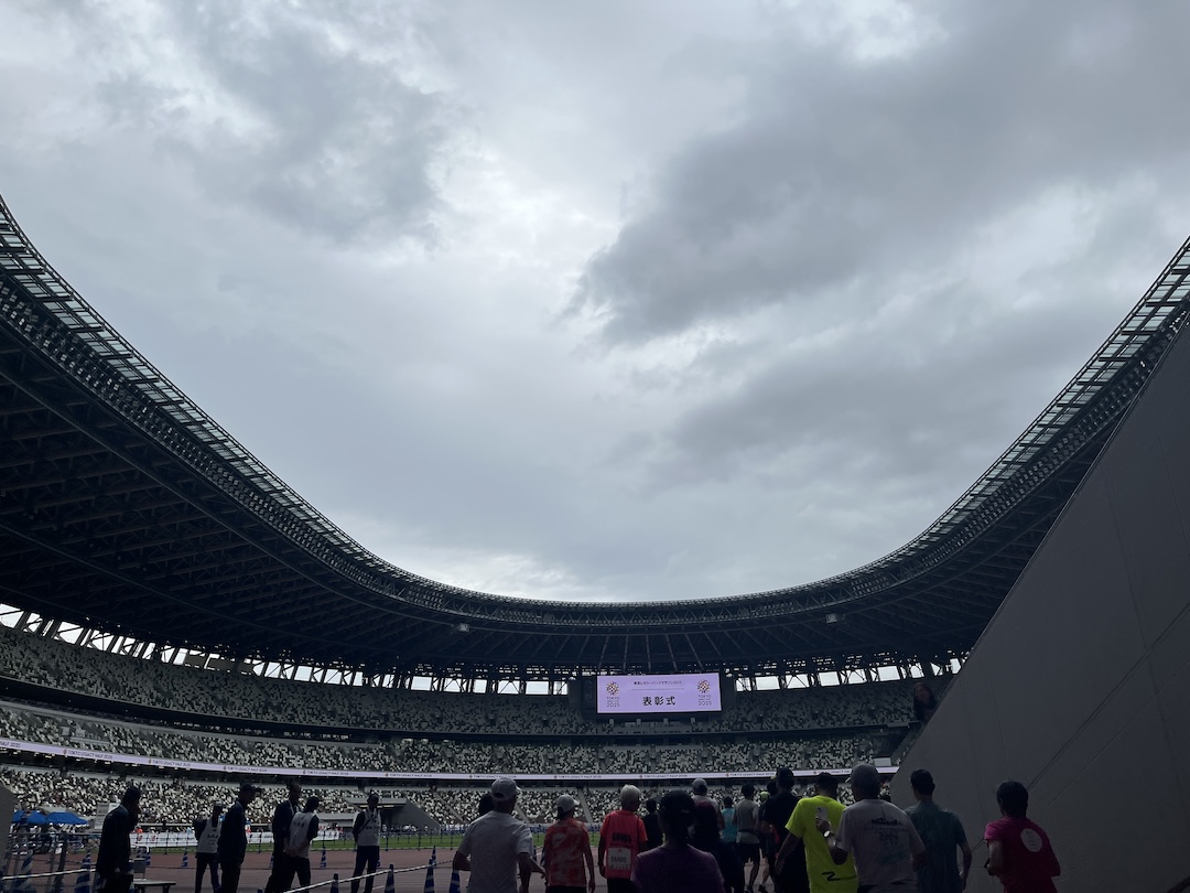 ドドーン!と目前に広がる国立競技場のトラック。ここからスタートし、20キロちょっと走ってここに戻ってくるわけです。たまに自分でも「何をしているんだ?」と思うこともありますが、まぁマラソンってそういうところありますよね。