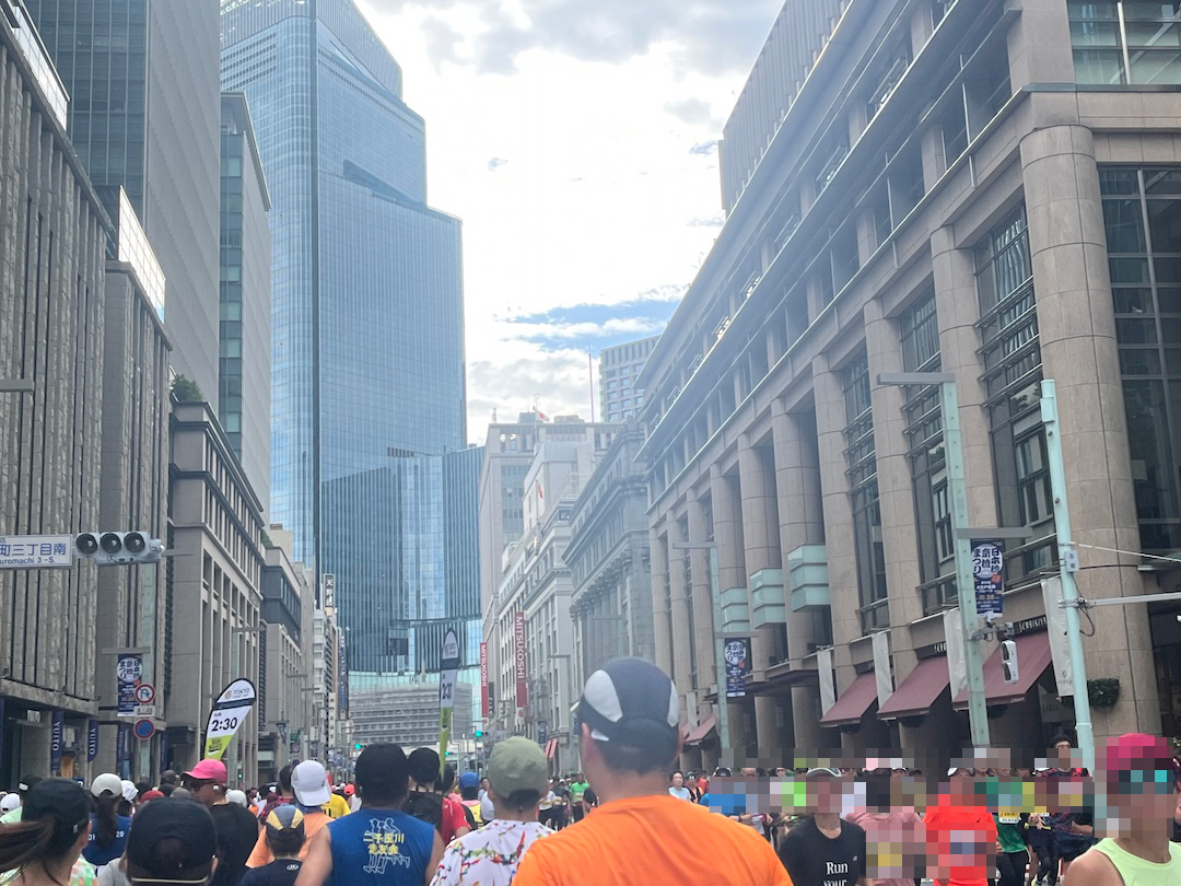 普段は車でひしめき合う日本橋付近も、この日に走るのを許されているのはランナーだけ。いつもは歩道からしか見られない建物も、車道に出て見上げるだけでだいぶ雰囲気が変わります。そして、まだペースランナーを追い抜けていません。