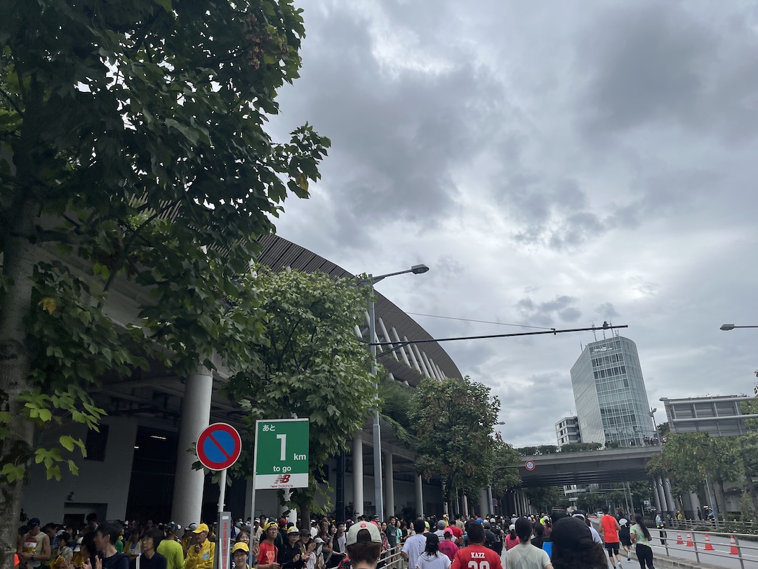 ゴールまでもう少し、というところで雨模様に。もう少し速く走れたならば、雨を回避できたのだなぁとしみじみ思いながら、雨に濡れざるを得ない残り1キロとなりました。さすがに国立競技場付近は観客が多く、すでにゴールしたランナーが「あとちょっと!」と励ましてくれたりもします。