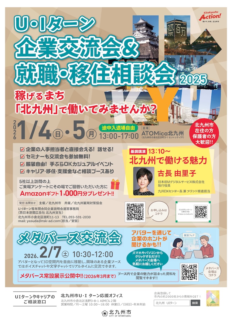 北九州市は、2026年1月4日(日)・5日(月)の2日間、「企業交流会&就職・移住相談会」を小倉北区のATOMica北九州で開催します。時間は各日13:00〜17:00、参加無料で途中入退場もOKです。