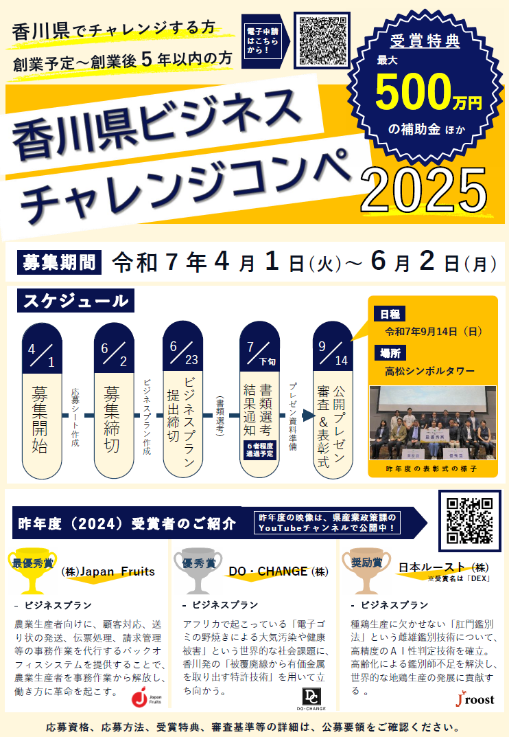 「香川県ビジネスチャレンジコンペ2025」募集開始!!〜県経済の活性化に繋がる、独創的なビジネスプランを募集します!!〜
