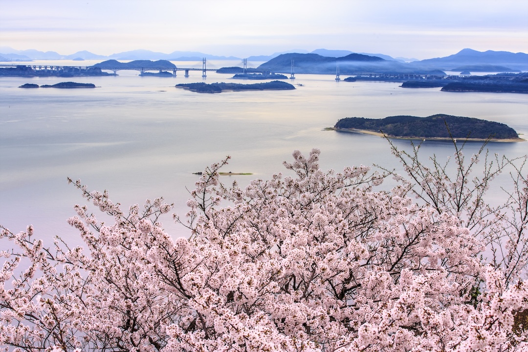 目の前には瀬戸内海の島々が広がる、桜と海が重なる風景はこの場所ならではです。