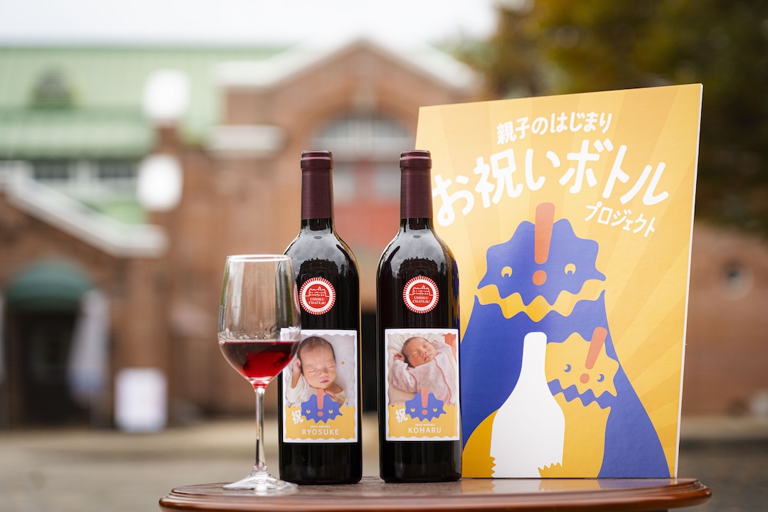 本プロジェクトは、市内で出生した子どもとその保護者を対象に、国指定重要文化財「牛久シャトー」と連携し、ご家族やお子さんの写真をあしらったワインまたはぶどうジュースを記念ボトルとして贈呈するものです。