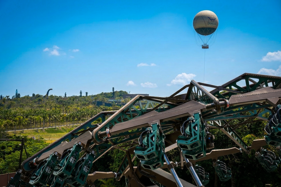 ライドが回転し始めると、深い緑の渓谷が眼下に広がり、そのまま沖縄の大空へと上昇。頂上で逆さまになると、青空が足元いっぱいに広がる非日常の景色が楽しめます。