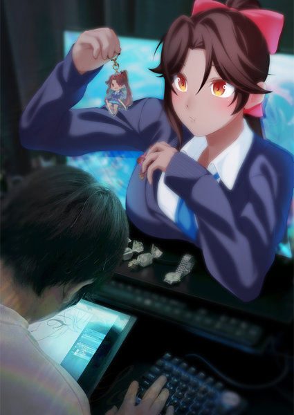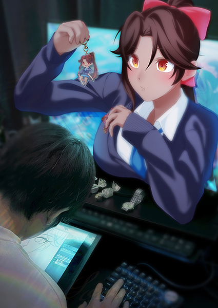 絵の左下に写っている人は僕で、燈風夏を描いている、つまり3次元で2次元のものを制作しているのですが、画面からは燈風夏が飛び出してきているし、彼女は現実にあるチョコレートを食べたり、自分をモデルにしたキーホルダーも手に取っています。